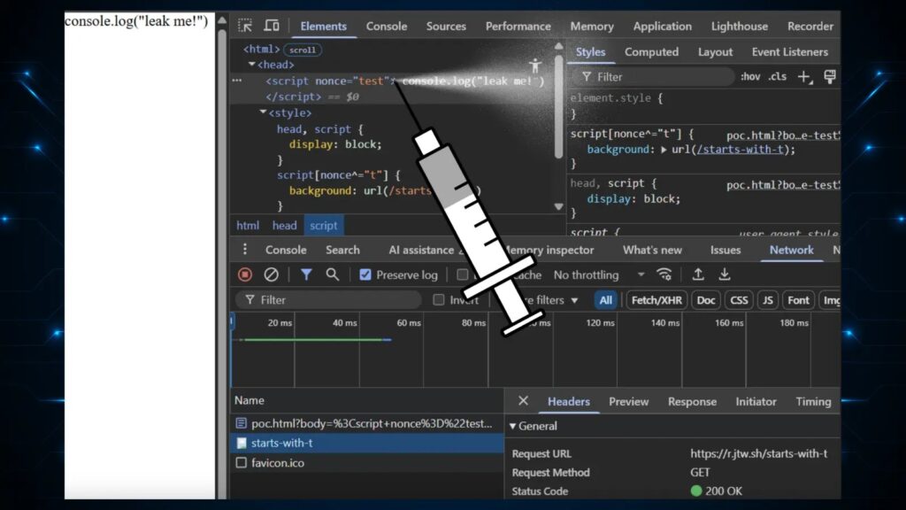 Istraživački tim je otkrio da, iako su nonce atributi u oznakama skripti zaštićeni od CSS selektora iz sigurnosnih razloga, iste vrijednosti koje se nalaze u atributima sadržaja meta oznaka ostaju dostupne. Ovo omogućava napadačima sistematsko curenje nonce vrijednosti koristeći tehnike ubrizgavanja CSS-a koje generišu višestruke zahtjeve u pozadini, efektivno rekonstruišući kompletan nonce putem preklapajućih sekvenci znakova.